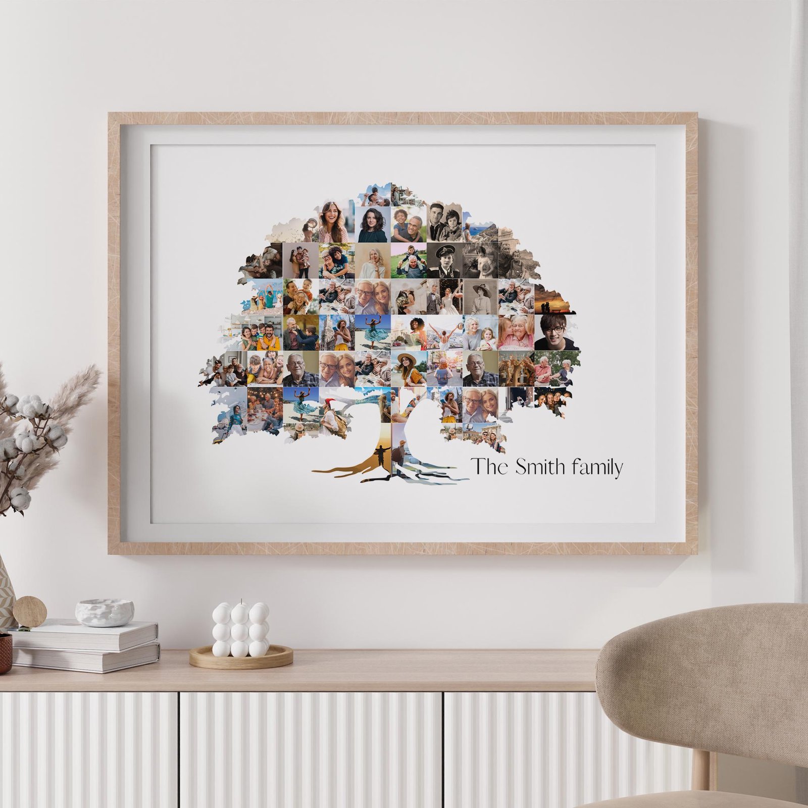 Imagine gifting this to your mom on Mother’s Day — a collage of her children and grandchildren, all tied together in one stunning piece. Or surprising first-time parents with a tree that begins with their new family and grows over the years. At a family reunion, it becomes a conversation starter, sparking stories from the past and dreams for the future.
