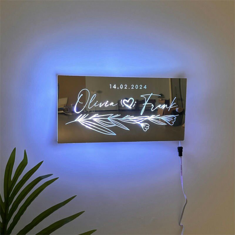 Imagine walking into a softly lit room and seeing your names or wedding date glowing on a beautiful mirrored surface. It’s not just décor—it’s your love, illuminated.